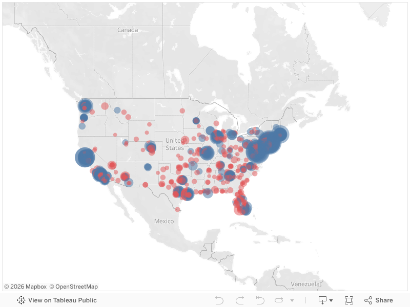 Two Texas cities close to the Mexican border—El Paso and Alamo—are in Trump’s top 500, which is interesting in light of Trump’s harsh stance on immigration. Now, since candidates submit monthly reports to the Federal Election Commission, we’ll create a new map each month until November 8. Check back in September.