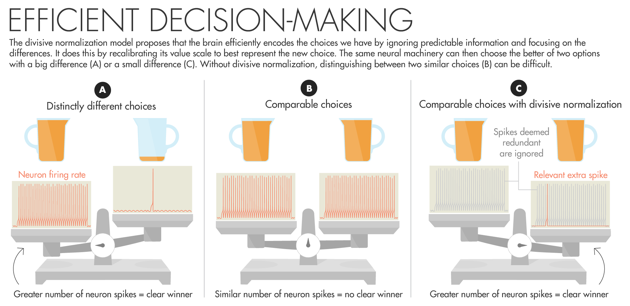 Glimcher’s model, known as divisive normalization, spells out the math behind this recalibration process. It proposes that neurons can send more efficient messages if they encode in their sequence of spikes only the relative differences among the choices. “Choice sets have a lot of shared information; they are not random and independent,” Glimcher said. “Normalization is sucking out redundant information so that the information coming out is as relevant as possible, wasting as little energy as possible.” He notes that engineers, who are used to working with adaptive systems, aren’t surprised by this idea. But people who study choice often are.