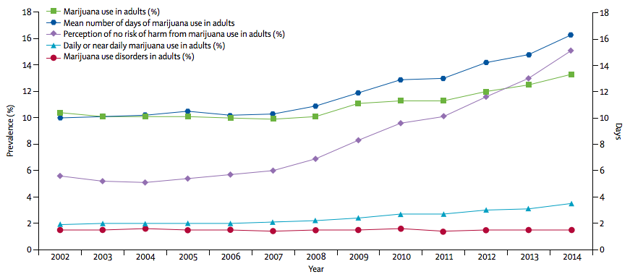 As more people view marijuana as a relatively safe drug, they’re more likely to try it. Since 2002, the CDC found, Americans have become more likely to buy weed and less likely to get it for free or share it. A Lancet Psychiatry study on adult marijuana use, also out this week, showed that Americans began to perceive less harm from marijuana use around 2007, at which point 12 states had legalized medical marijuana. That study also found no increase in “marijuana use disorders,” or feeling dependent on pot, despite a rise in use.
